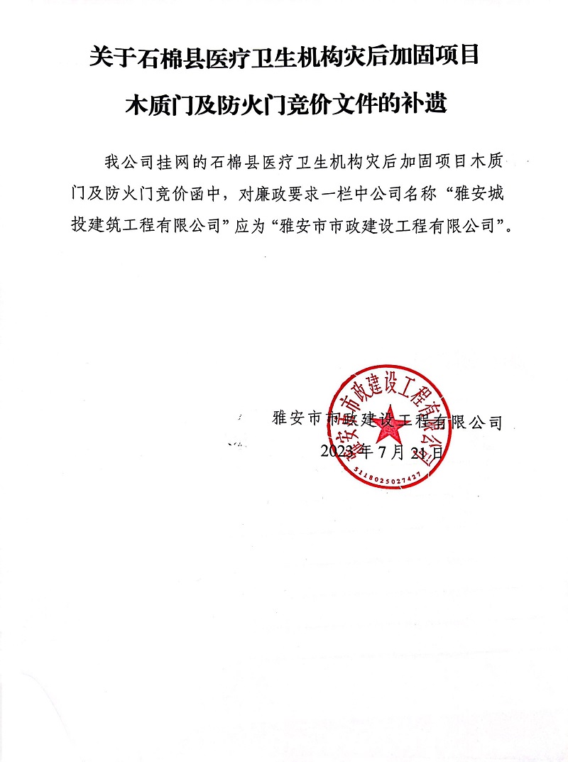 關(guān)于石棉縣醫(yī)療衛(wèi)生機(jī)構(gòu)災(zāi)后加固項(xiàng)目木質(zhì)門及防火門競價文件的補(bǔ)遺