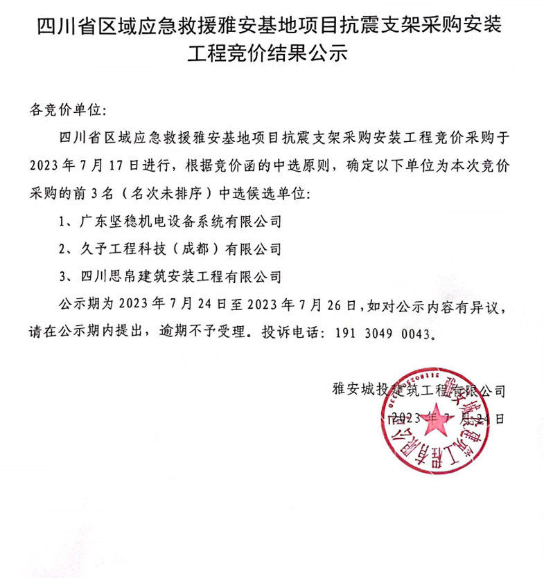 四川省區(qū)域應(yīng)急救援雅安基地項(xiàng)目抗震支架采購(gòu)安裝工程競(jìng)價(jià)結(jié)果公示