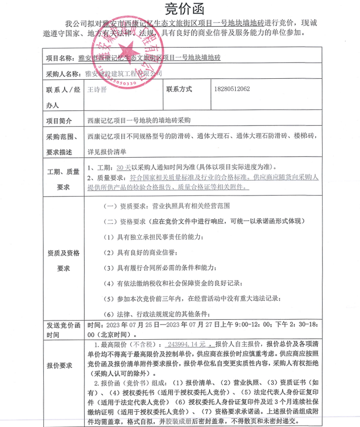 雅安市雅安市西康記憶生態(tài)文旅街區(qū)項目一號地塊墻地磚競價采購公告