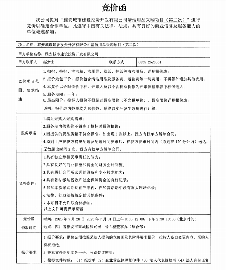 雅安城市建設投資開發(fā)有限公司清潔用品采購項目(第二次)競價公告