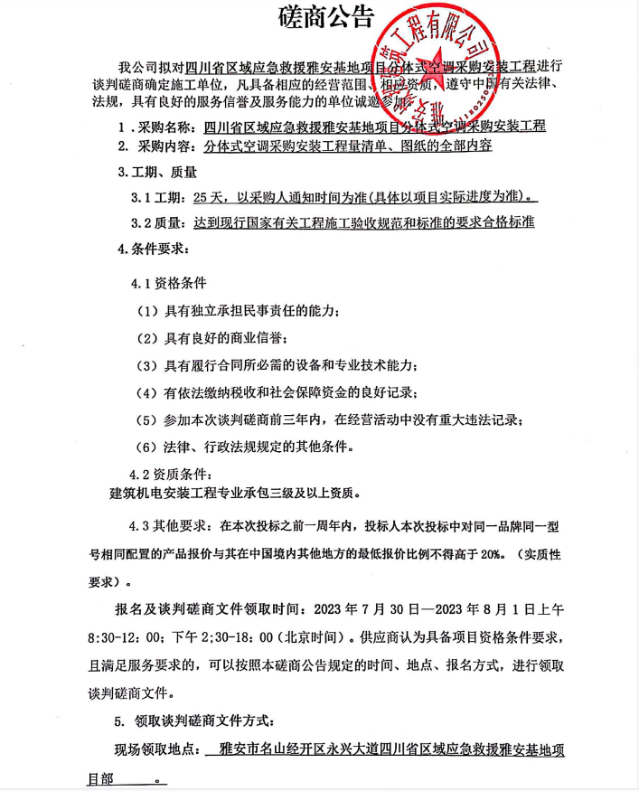 四川省區(qū)域應急救援雅安基地項目分體式空調(diào)采購安裝工程談判磋商公告