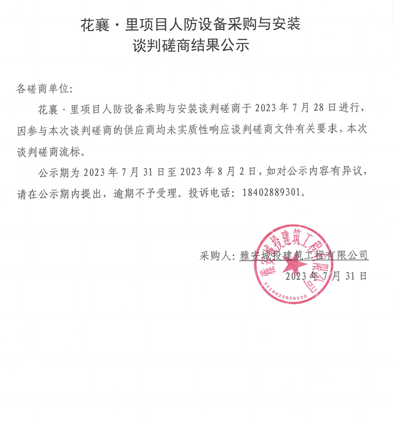 花襄·里項目人防設備采購與安裝談判磋商結(jié)果公示