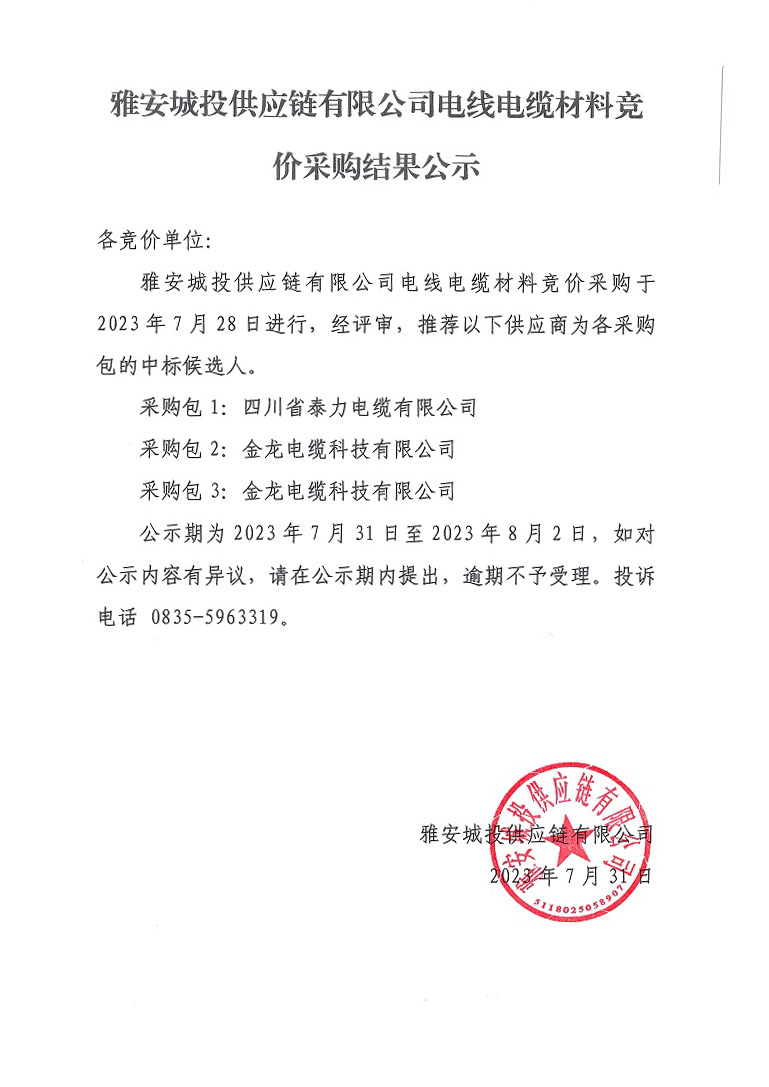雅安城投供應鏈有限公司電線電纜材料競價采購結(jié)果公示
