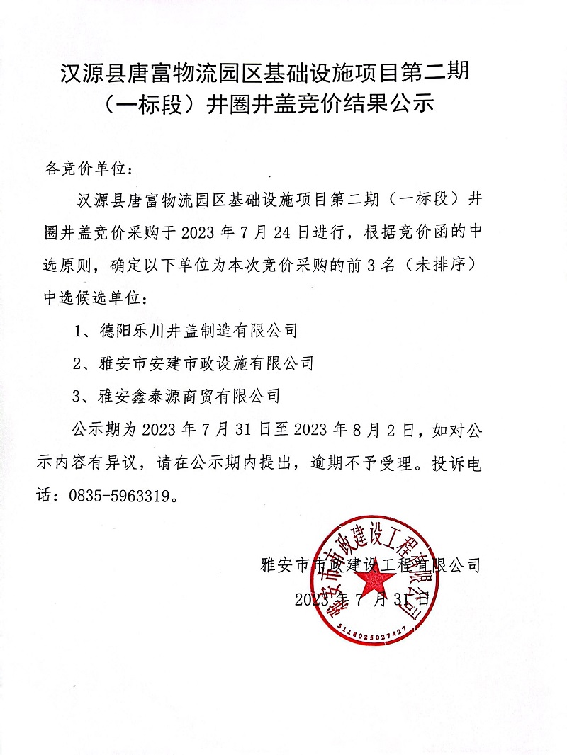 漢源縣唐富物流園區(qū)基礎(chǔ)設(shè)施項(xiàng)目第二期(一標(biāo)段)井圈井蓋采購競價(jià)結(jié)果公示