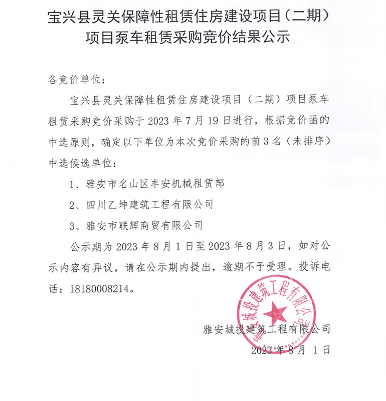 寶興縣靈關保障性租賃住房建設項目(二期)項目泵車租賃采購競價結果公示