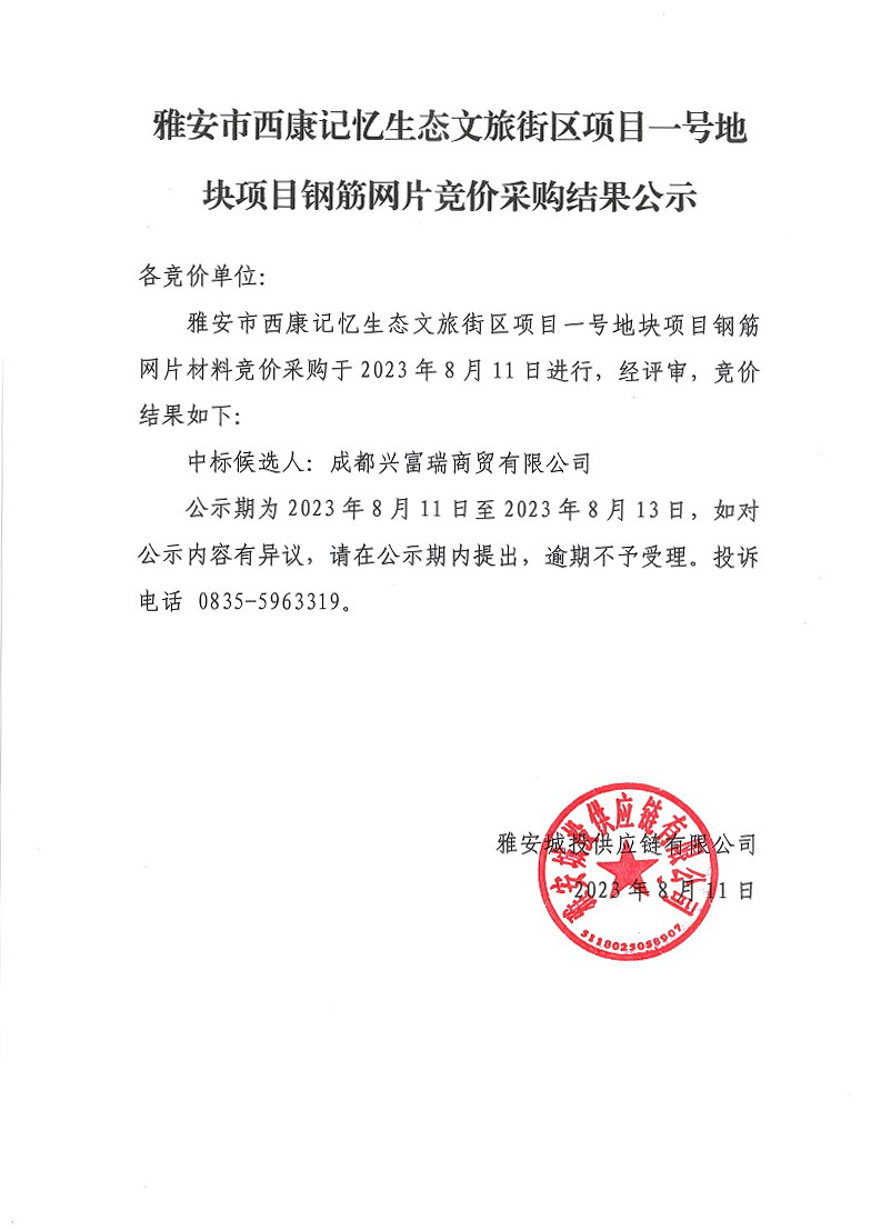 雅安市西康記憶生態(tài)文旅街區(qū)項目一號地塊項目鋼筋網(wǎng)片競價采購結果公示
