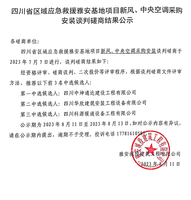四川省區(qū)域應(yīng)急救援雅安基地項目新風(fēng)、中央空調(diào)采購安裝談判磋商結(jié)果公示