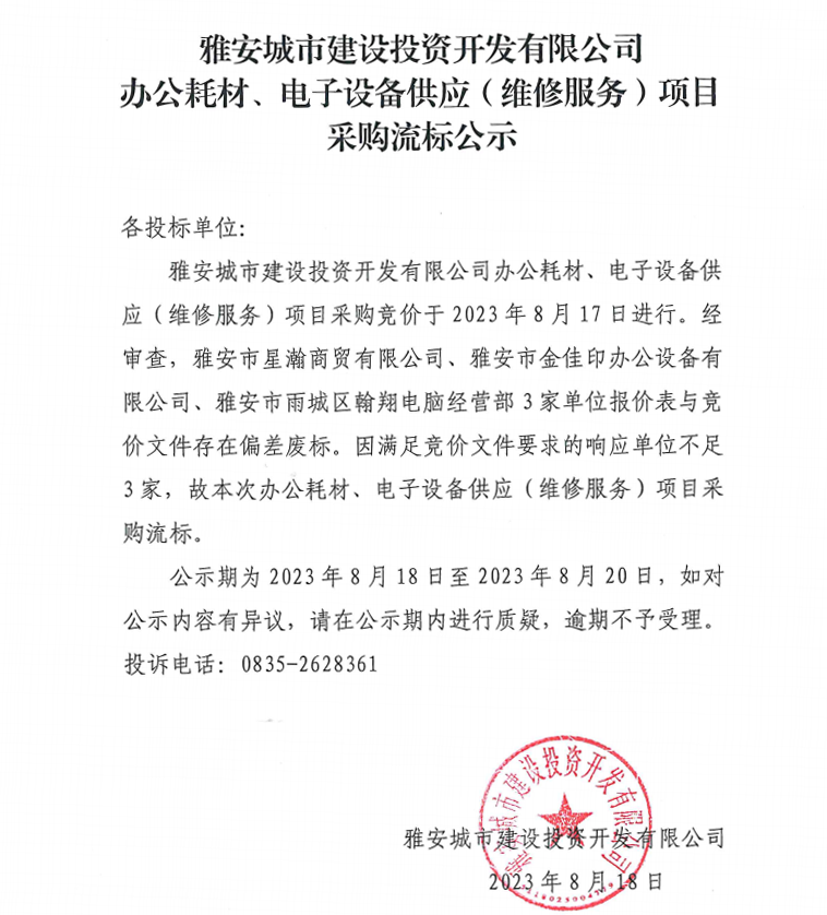 雅安城市建設(shè)投資開發(fā)有限公司辦公耗材、電子設(shè)備供應(yīng)(維修服務(wù))項(xiàng)目采購流標(biāo)公示