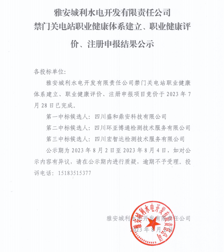 雅安城利水電開發(fā)有限責任公司禁門關(guān)電站職業(yè)健康體系建立、職業(yè)健康評價、注冊申報結(jié)果公示