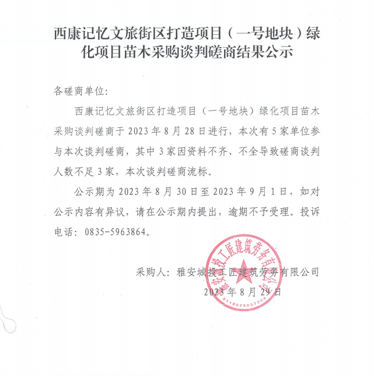 西康記憶文旅街區(qū)打造項(xiàng)目(一號(hào)地塊)綠化項(xiàng)目苗木采購(gòu)談判磋商結(jié)果公示