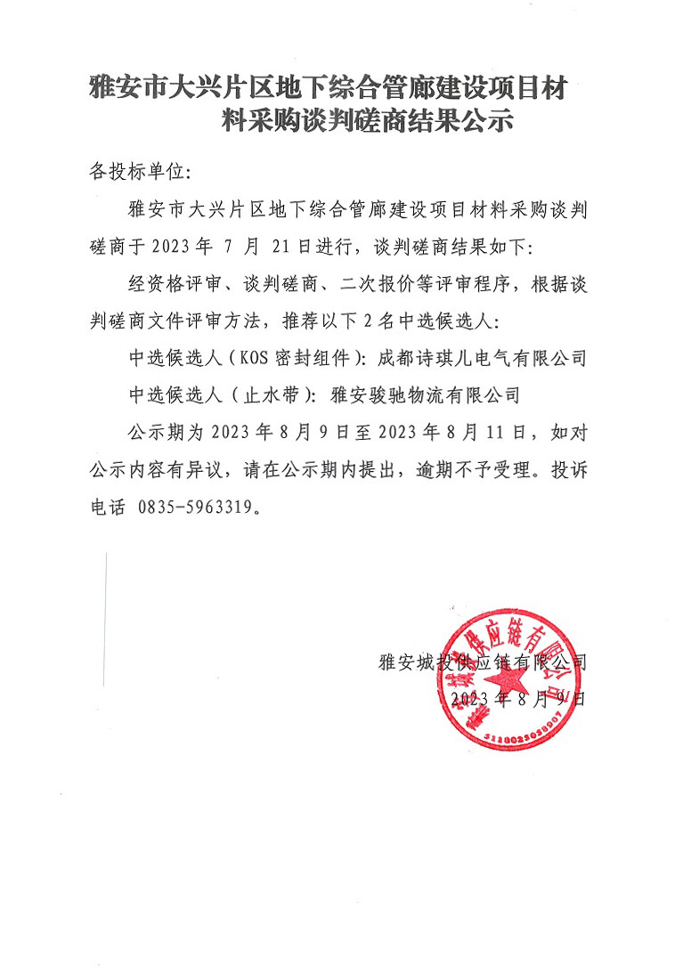 雅安市大興片區(qū)地下綜合管廊建設(shè)項(xiàng)目材料采購(gòu)談判磋商結(jié)果公示