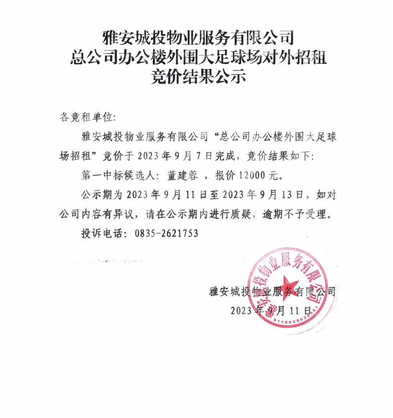 雅安城投物業(yè)服務(wù)有限公司總公司辦公樓外圍大足球場(chǎng)對(duì)外招租競(jìng)價(jià)結(jié)果公示
