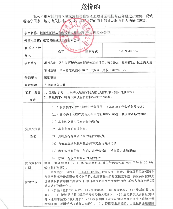 四川省區(qū)域應(yīng)急救援雅安基地項(xiàng)目充電樁專業(yè)分包競價(jià)公告