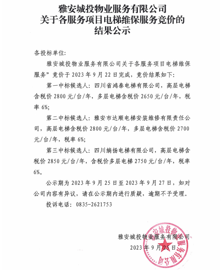 雅安城投物業(yè)服務(wù)有限公司關(guān)于各服務(wù)項(xiàng)目電梯維保服務(wù)競價的結(jié)果公示