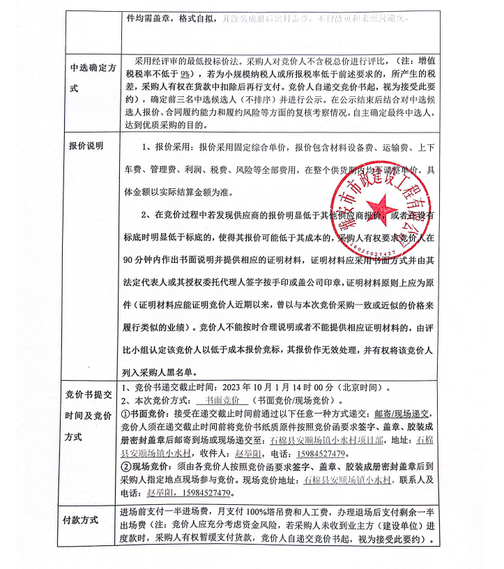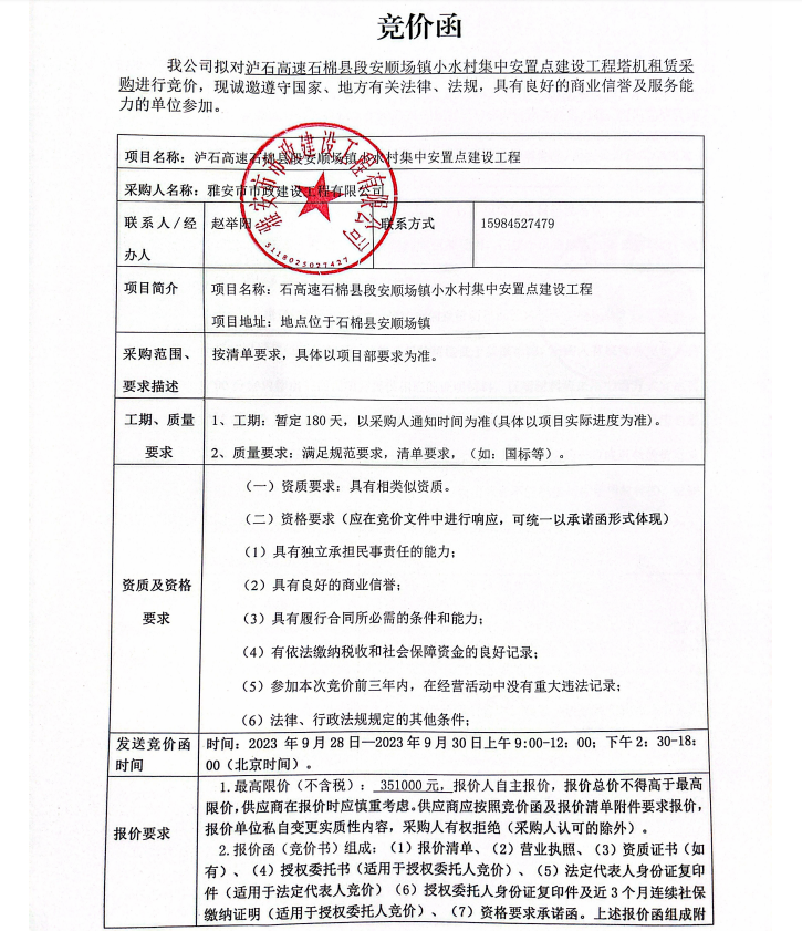 瀘石高速石棉縣段安順場鎮(zhèn)小水村集中安置點建設工程塔機租賃采購競價公告