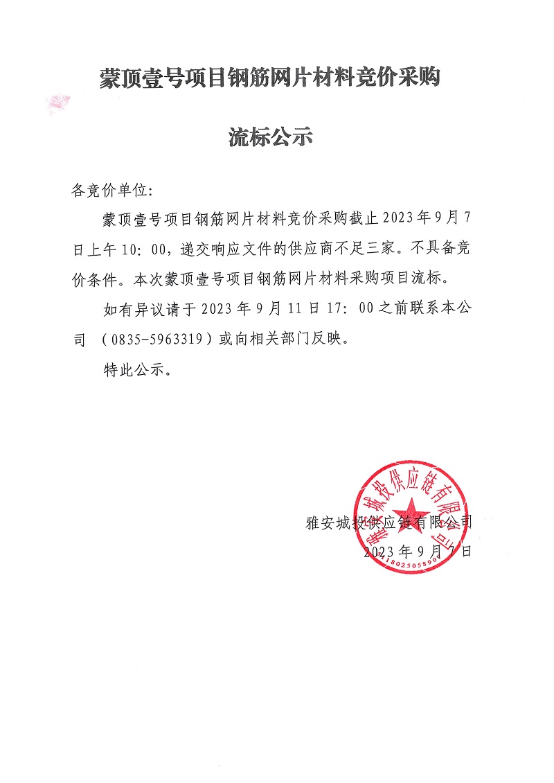蒙頂壹號項目鋼筋網(wǎng)片材料競價采購流標(biāo)公示