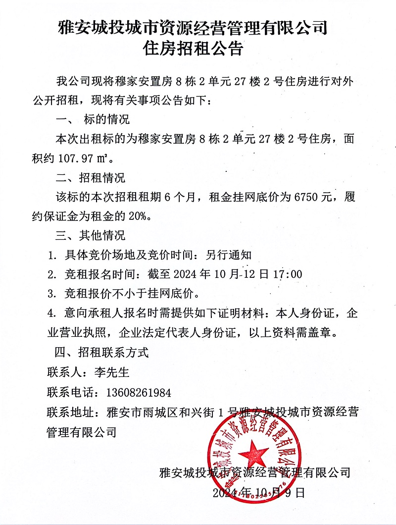 雅安城投城市資源經(jīng)營管理有限公司關(guān)于穆家安置房8棟2單元27樓2號住房招租公告