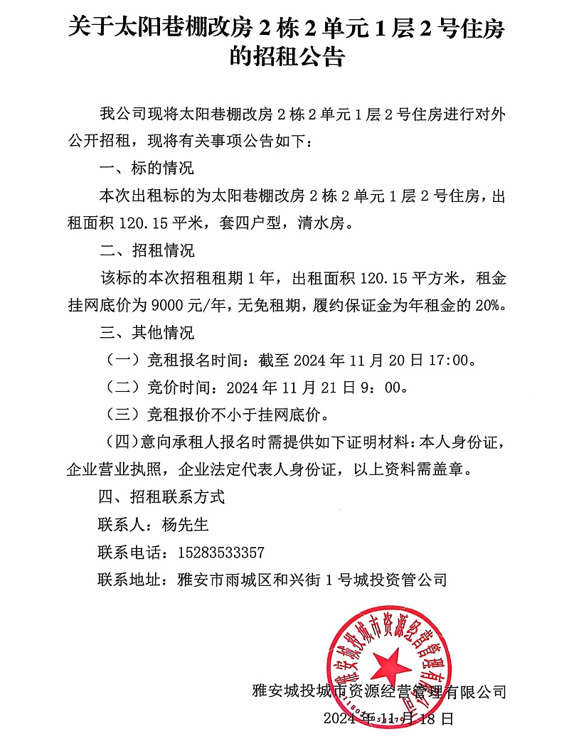 關(guān)于太陽(yáng)巷棚改房2棟2單元1層2號(hào)住房的招租公告