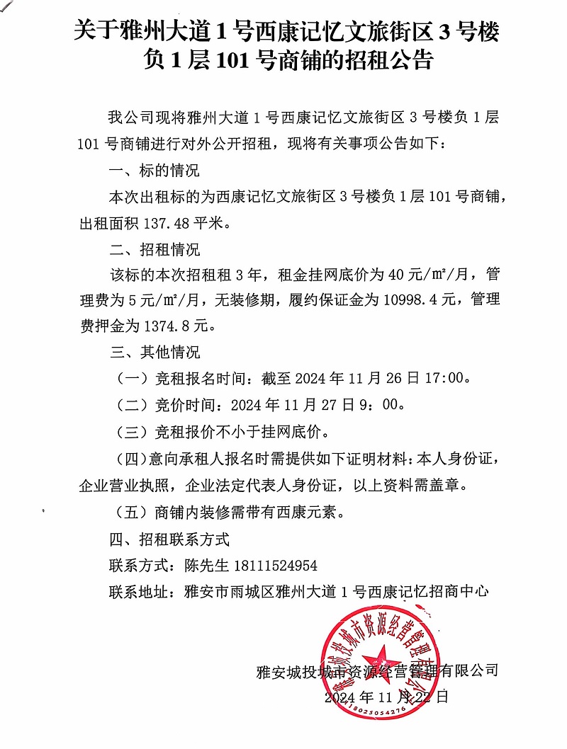 關于雅州大道1號西康記憶文旅街區(qū)3號樓負1層101號商鋪的招租公告