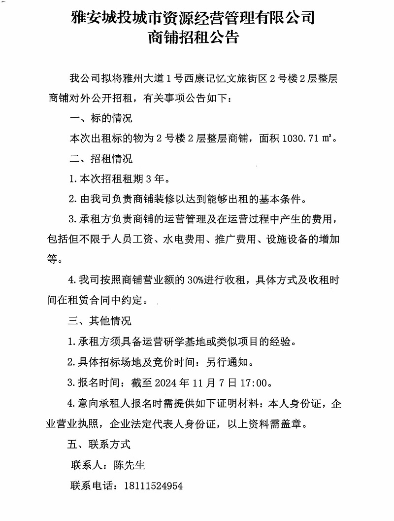 雅安城投城市資源經(jīng)營管理有限公司雅州大道1號西康記憶文旅街區(qū)2號樓2層整層商鋪招租公告