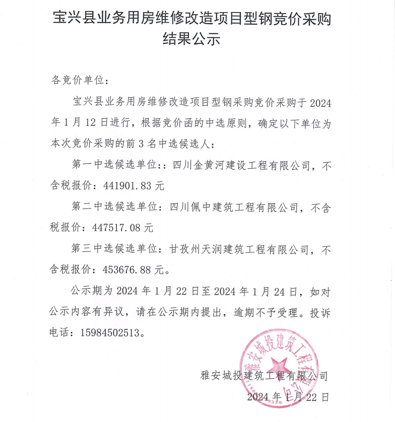 寶興縣業(yè)務(wù)用房維修改造項目型鋼競價采購結(jié)果公示