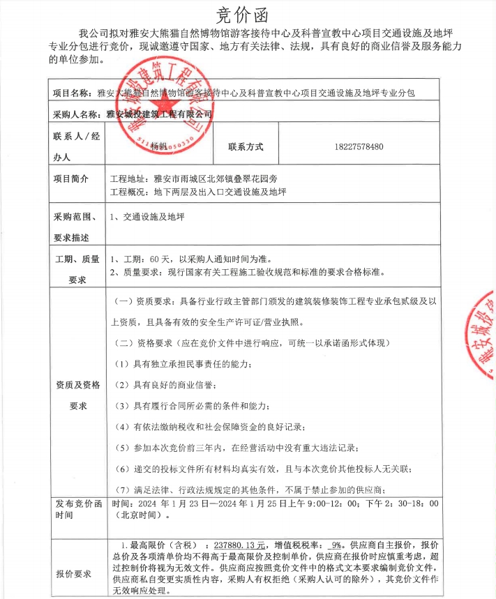 雅安大熊貓自然博物館游客接待中心及科普宣教中心項(xiàng)目交通設(shè)施及地坪專業(yè)分包競(jìng)價(jià)公告