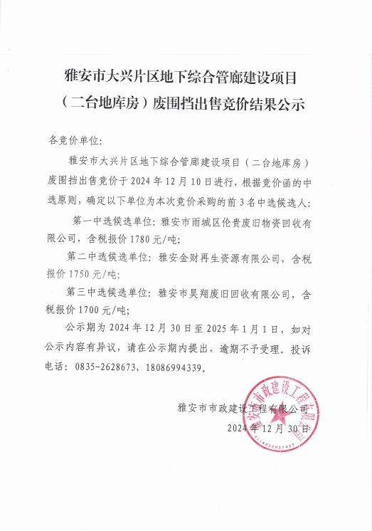 雅安市大興片區(qū)地下綜合管廊建設(shè)項(xiàng)目 (二臺(tái)地庫房)廢圍擋出售竟價(jià)結(jié)果公示