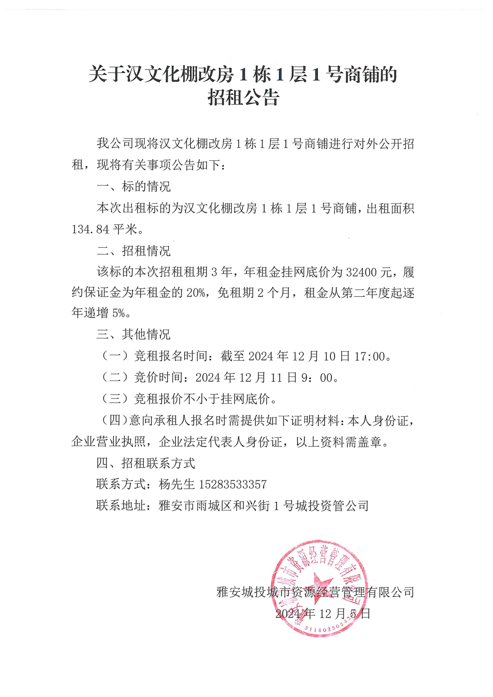 關(guān)于漢文化棚改房1棟1層1號(hào)商鋪招租公告