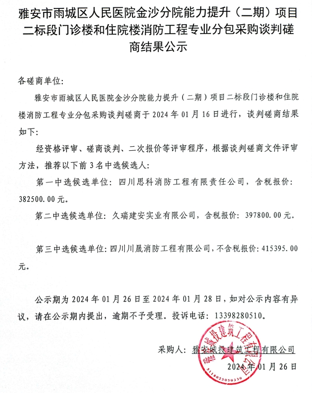 雅安市雨城區(qū)人民醫(yī)院金沙分院能力提升(二期)項目二標段門診樓和住院樓消防工程專業(yè)分包采購談判磋商結(jié)果公示