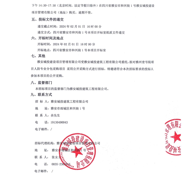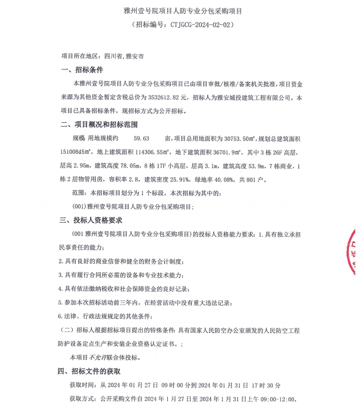 雅州壹號(hào)院項(xiàng)目人防專業(yè)分包采購項(xiàng)目公告
