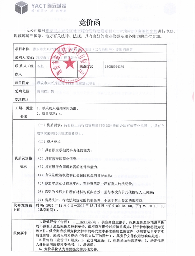 雅安市大興片區(qū)地下綜合管廊建設(shè)項(xiàng)目(二臺(tái)地庫(kù)房)廢圍擋出售競(jìng)價(jià)公告