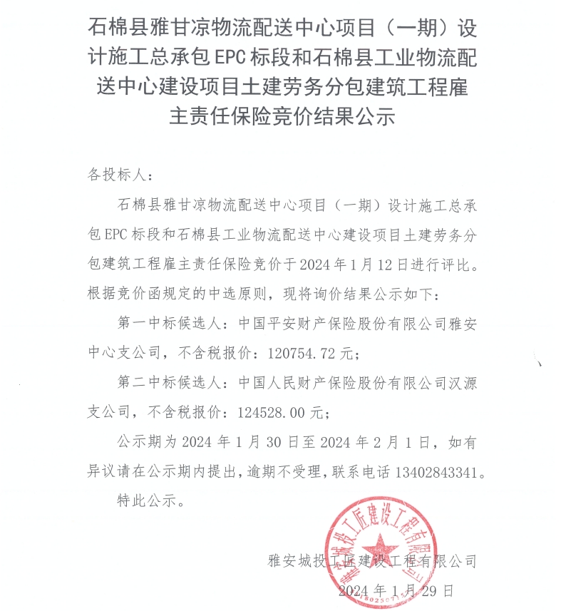 石棉縣雅甘涼物流配送中心項目(一期)設計施工總承包EPC標段和石棉縣工業(yè)物流配送中心建設項目土建勞務分包建筑工程雇主責任保險競價結果公示