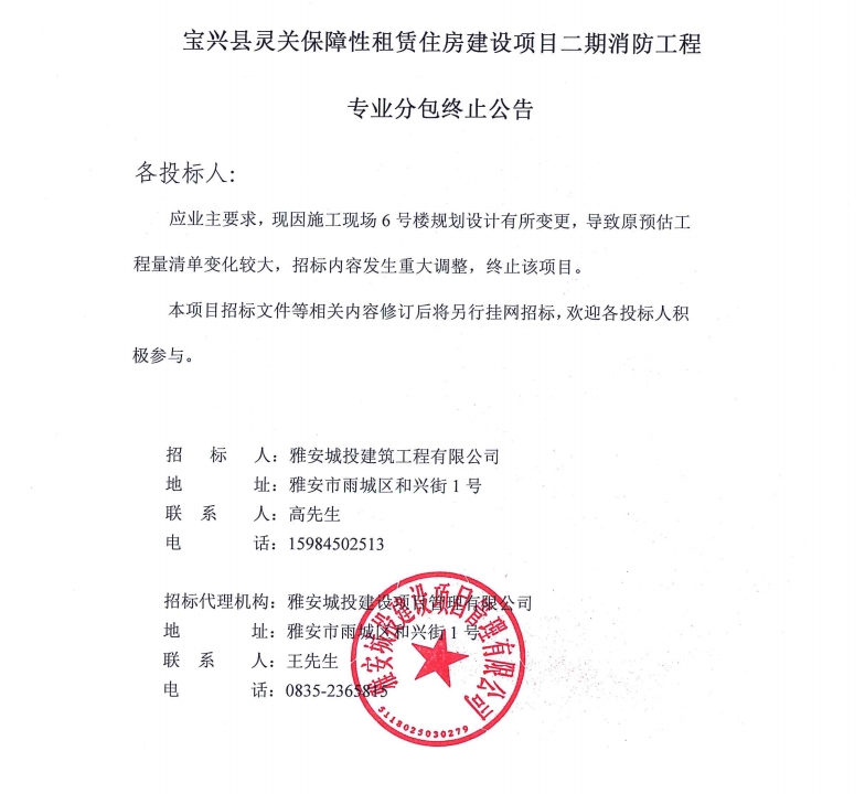 寶興縣靈關(guān)保障性租賃住房建設(shè)項(xiàng)目二期消防工程專業(yè)分包終止公告