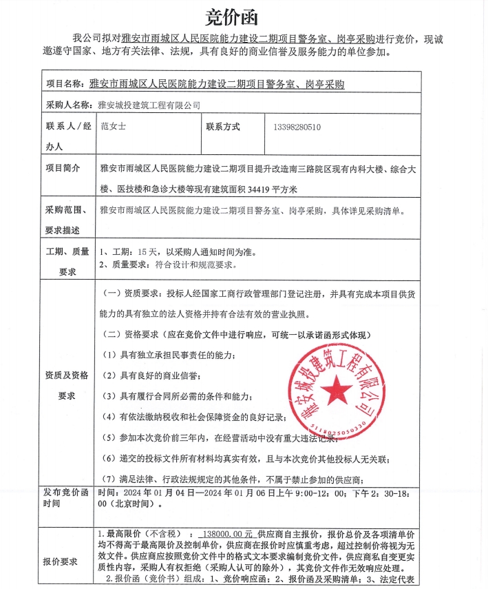 雅安市雨城區(qū)人民醫(yī)院能力建設(shè)二期項(xiàng)目警務(wù)室、崗?fù)げ少徃們r(jià)公告