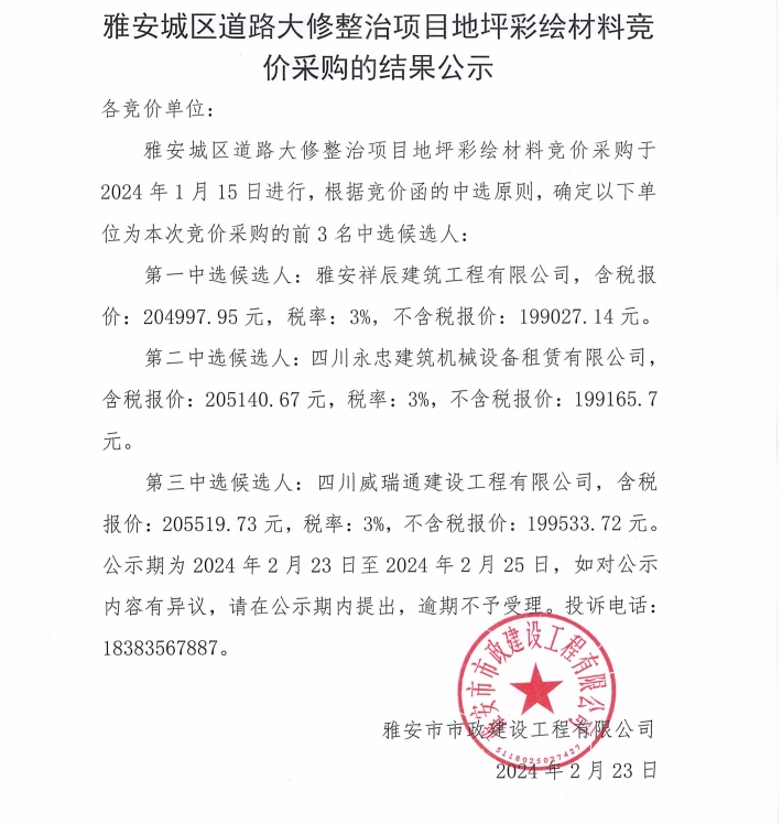 雅安城區(qū)道路大修整治項目地坪彩繪材料競價采購的結果公示