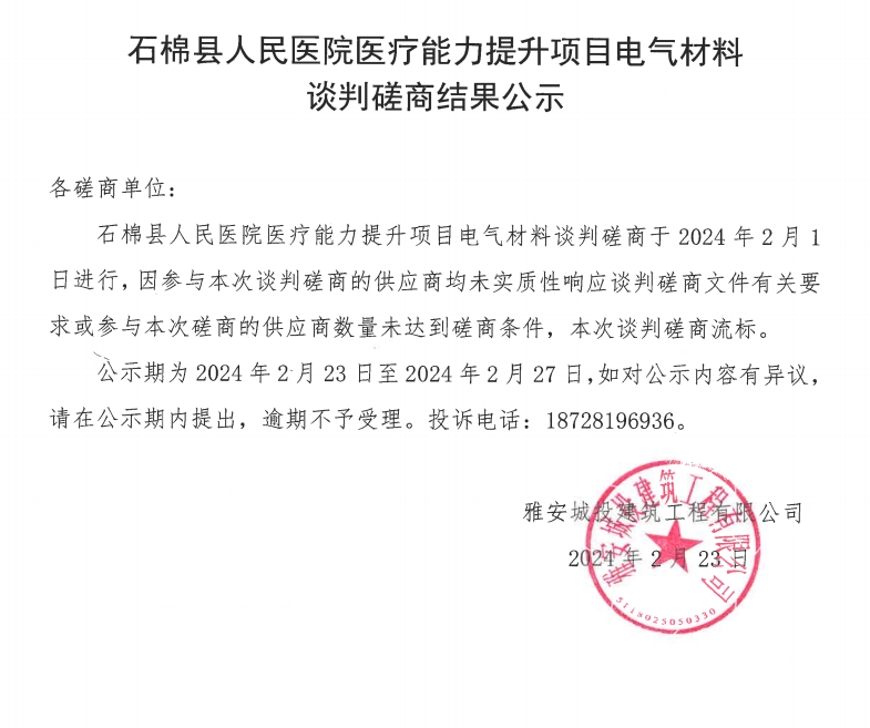 石棉縣人民醫(yī)院醫(yī)療能力提升項(xiàng)目電氣材料談判磋商結(jié)果公示