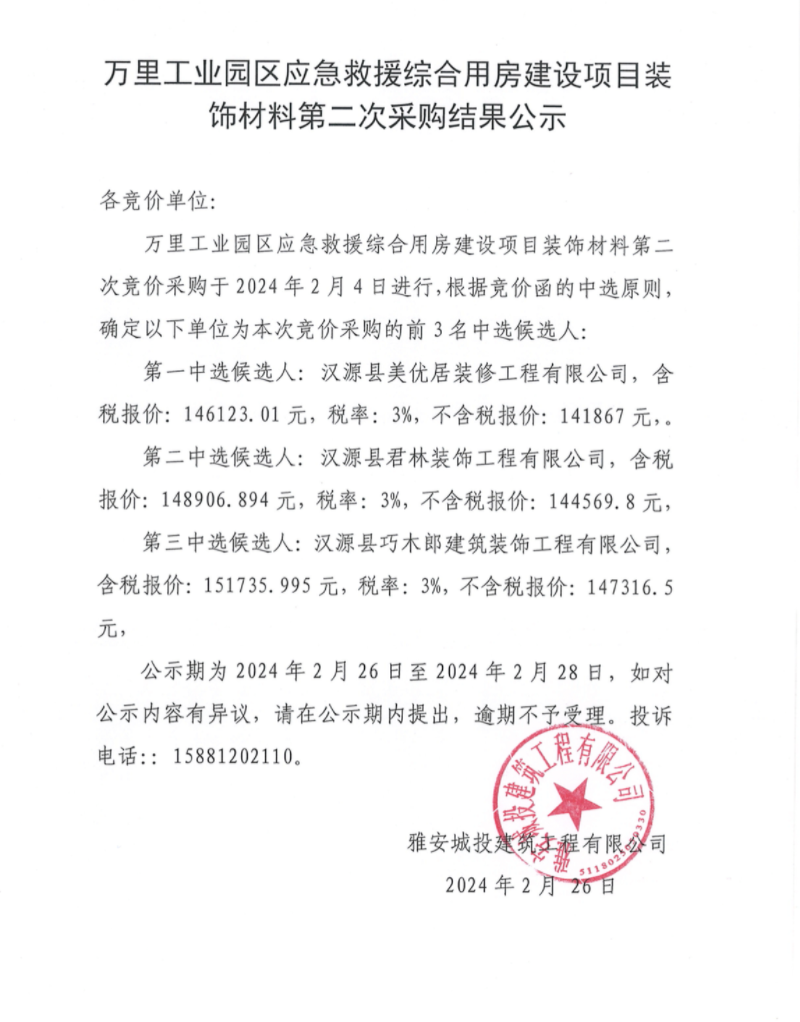 萬里工業(yè)園區(qū)應(yīng)急救援綜合用房建設(shè)項(xiàng)目裝飾材料第二次采購(gòu)結(jié)果公示