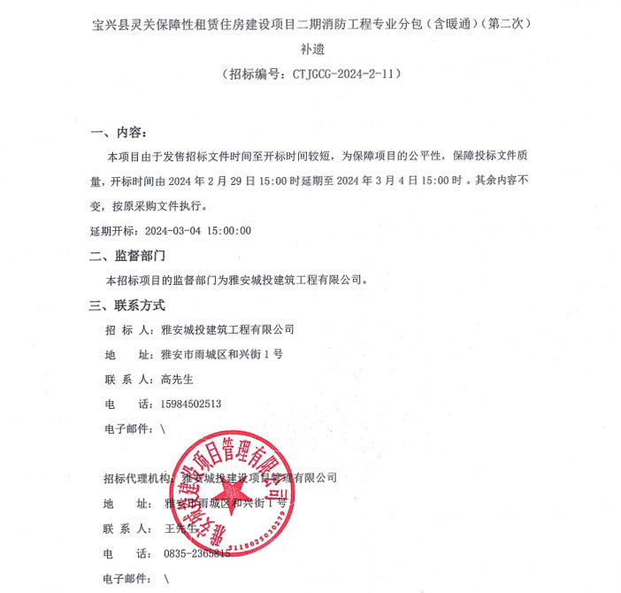 寶興縣靈關(guān)保障性租賃住房建設(shè)項目二期消防工程專業(yè)分包(含暖通)(第二次)補(bǔ)遺公告