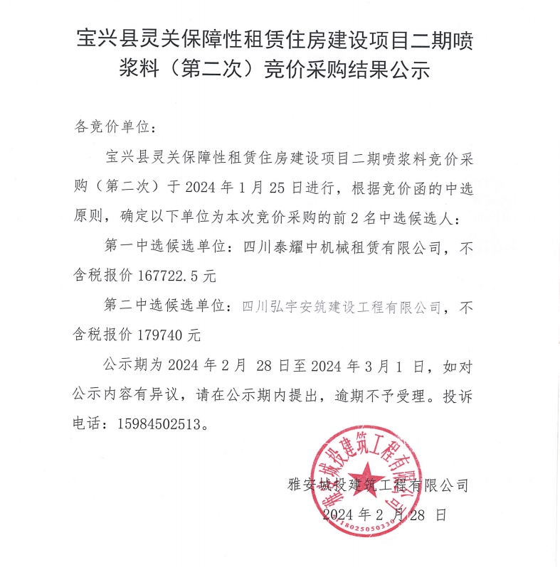 寶興縣靈關(guān)保障性租賃住房建設(shè)項目二期噴漿料(第二次)競價采購結(jié)果公示