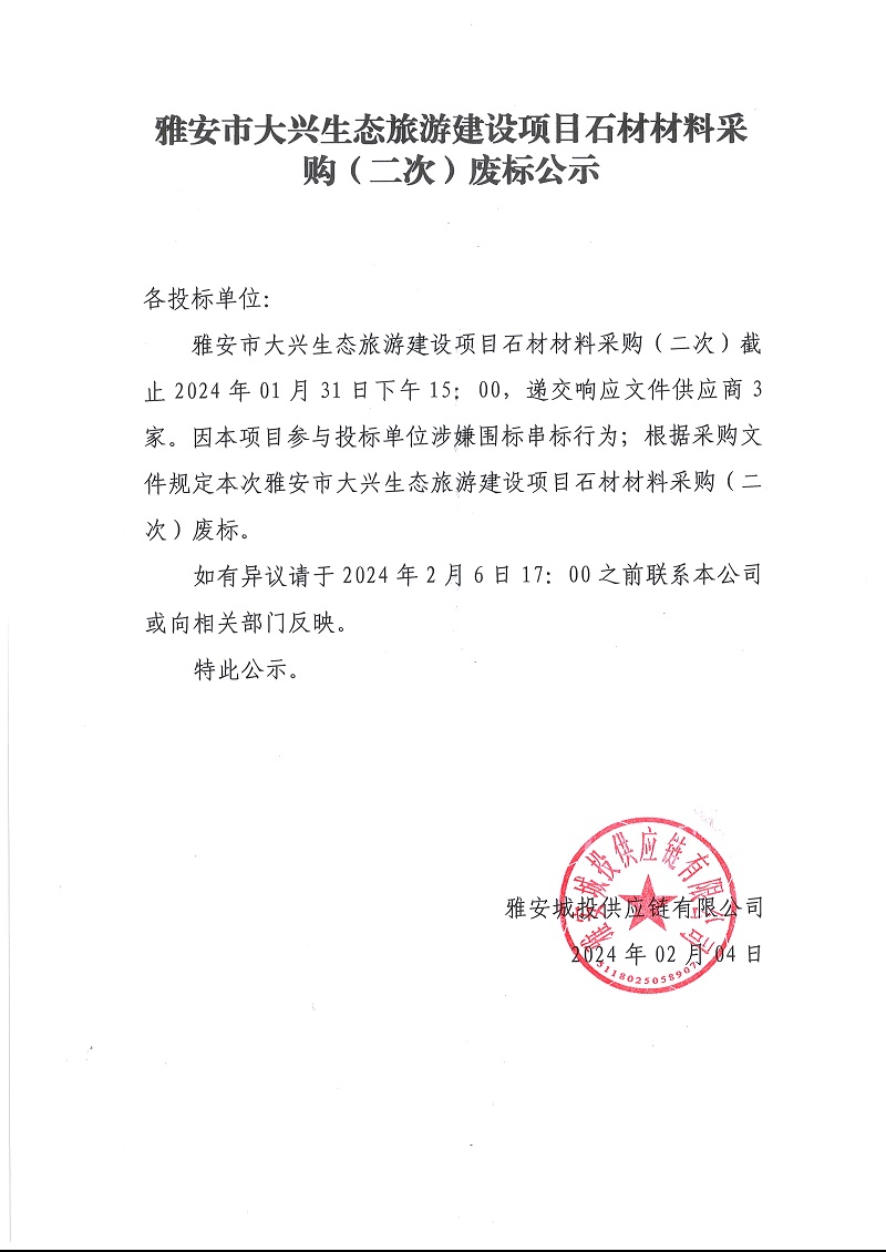 雅安市大興生態(tài)旅游建設(shè)項(xiàng)目石材材料采購(二次)廢標(biāo)公示