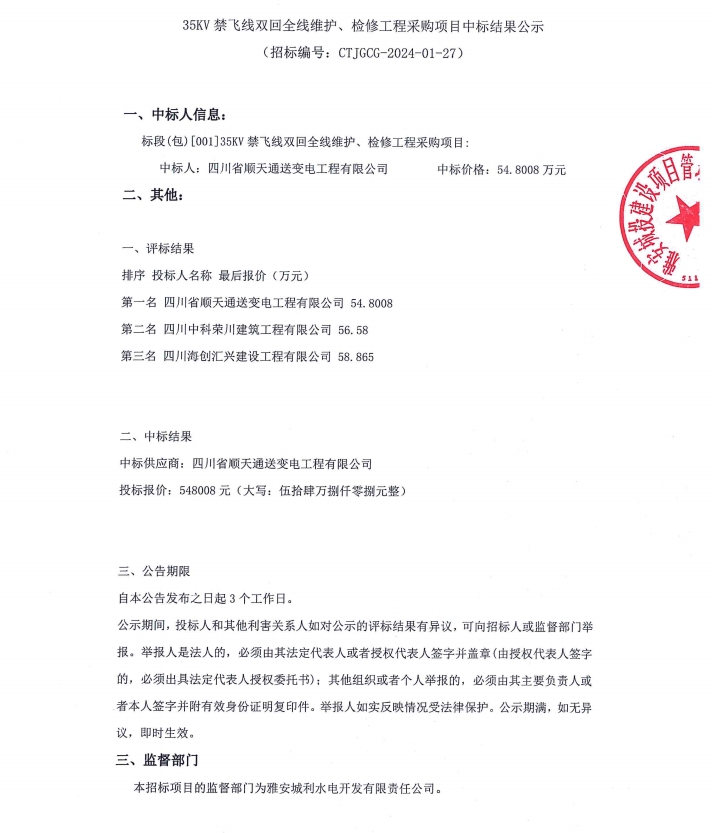35KV禁飛線雙回全線維護、檢修工程采購項目中標結(jié)果公示