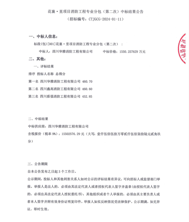 花襄·里項(xiàng)目消防工程專(zhuān)業(yè)分包(第二次)中標(biāo)結(jié)果公告