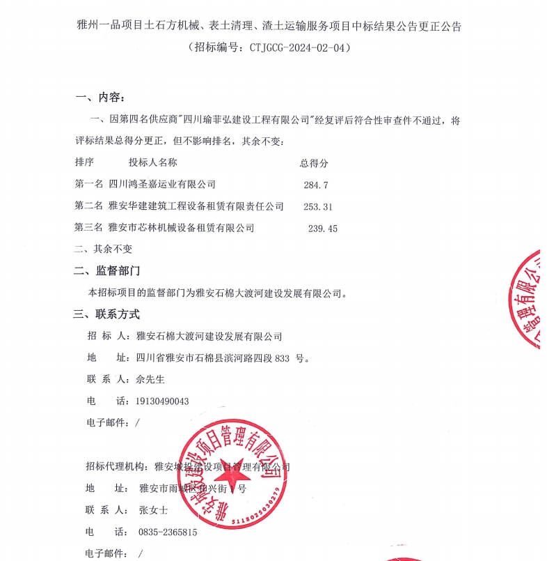 雅州一品項目土石方機械、表土清理、渣土運輸服務項目中標結果公告更正公告