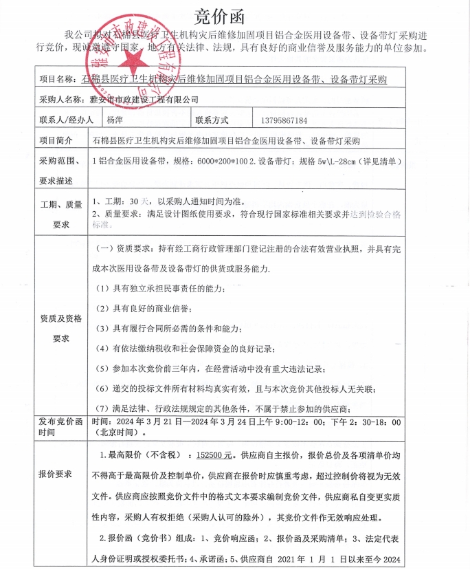 石棉縣醫(yī)療衛(wèi)生機(jī)構(gòu)災(zāi)后維修加固項(xiàng)目鋁合金醫(yī)用設(shè)備帶、設(shè)備帶燈采購(gòu)競(jìng)價(jià)公告