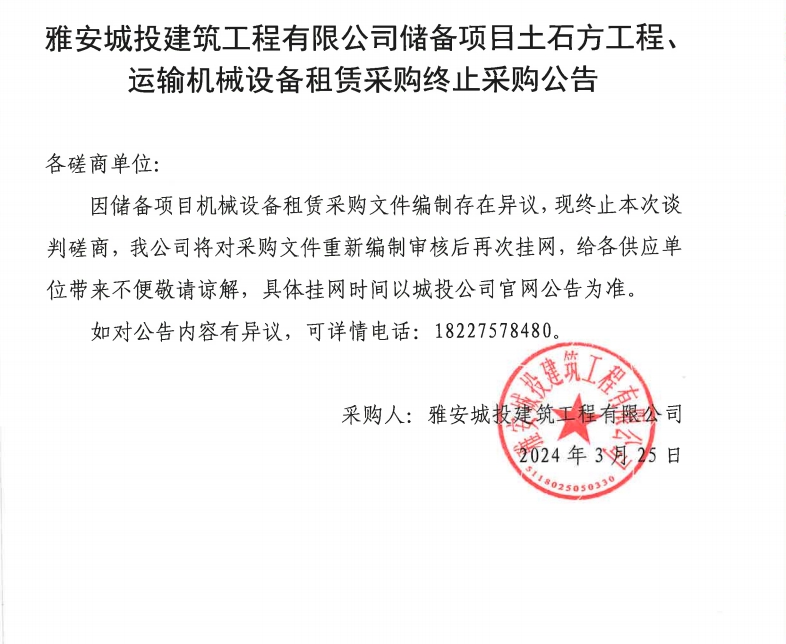 雅安城投建筑工程有限公司儲備項目土石工程、運輸機械設(shè)備租賃采購終止采購公告