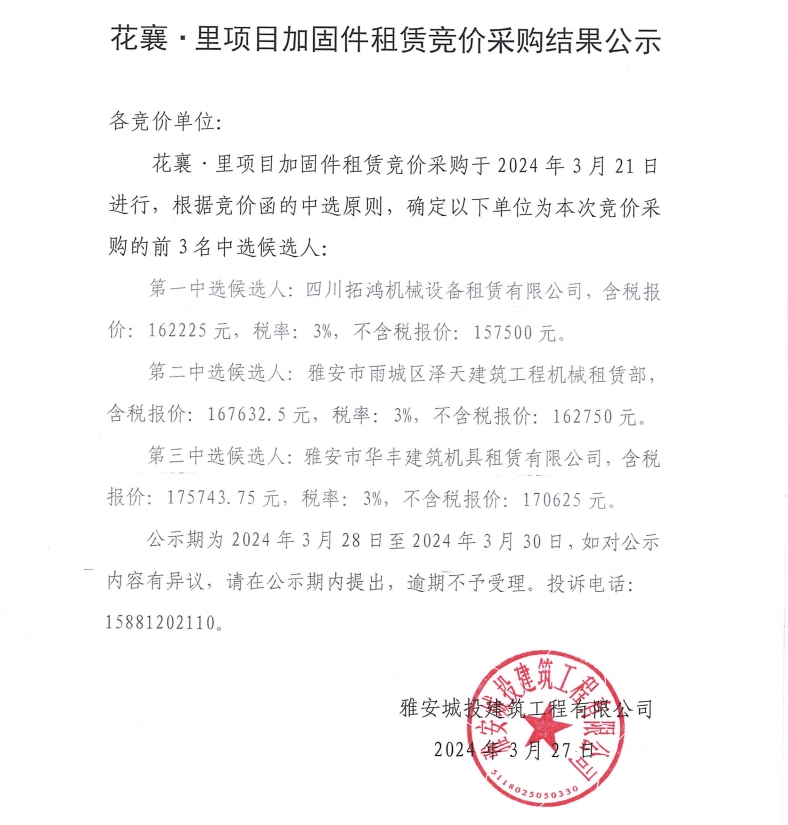 花襄·里項(xiàng)目加固件租賃競價采購結(jié)果公示