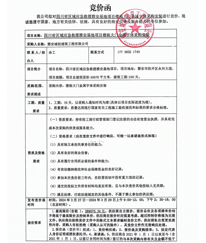 四川省區(qū)域應(yīng)急救援雅安基地項(xiàng)目樓棟大門金屬字體采購(gòu)安裝競(jìng)價(jià)公告