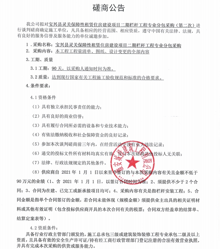 寶興縣靈關保障性租賃住房建設項目二期欄桿工程專業(yè)分包采購(第二次)磋商公告