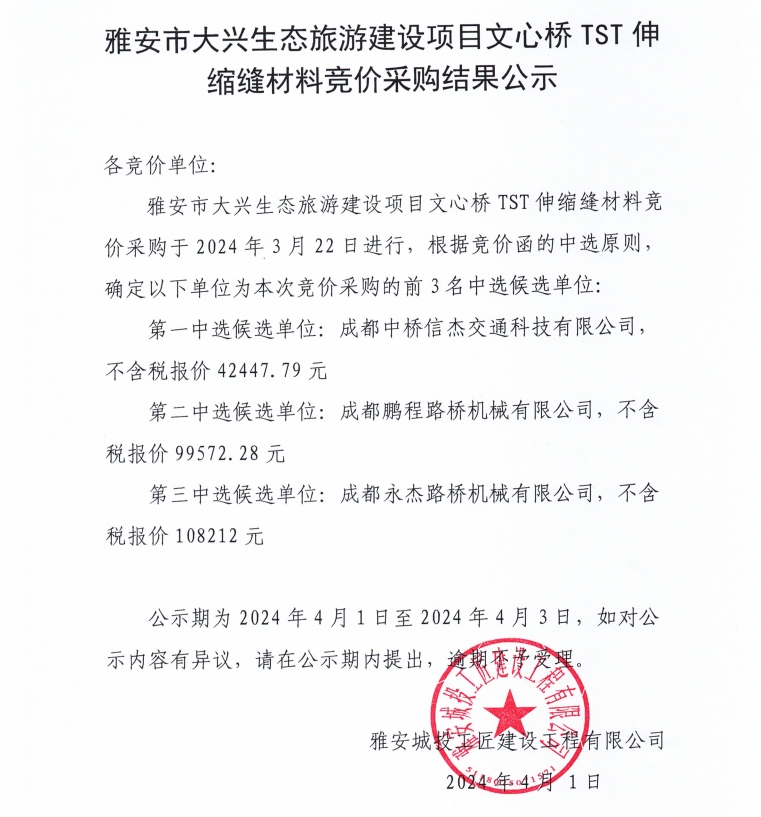 雅安市大興生態(tài)旅游建設項目文心橋TST伸縮縫材料競價采購結果公示