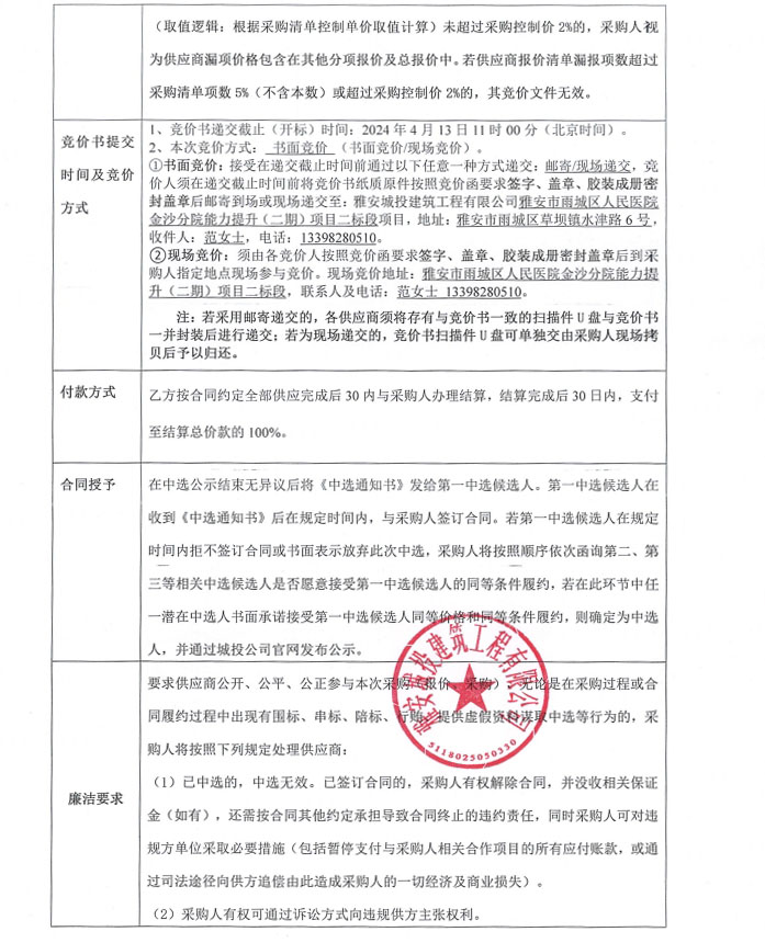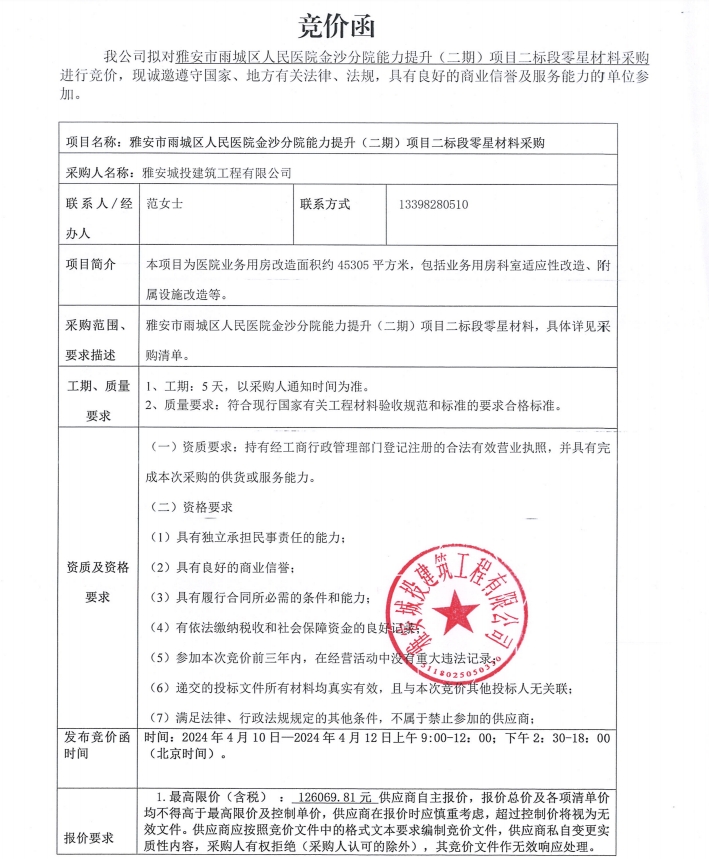雅安市雨城區(qū)人民醫(yī)院金沙分院能力提升(二期)項(xiàng)目二標(biāo)段零星材料采購競價(jià)公告